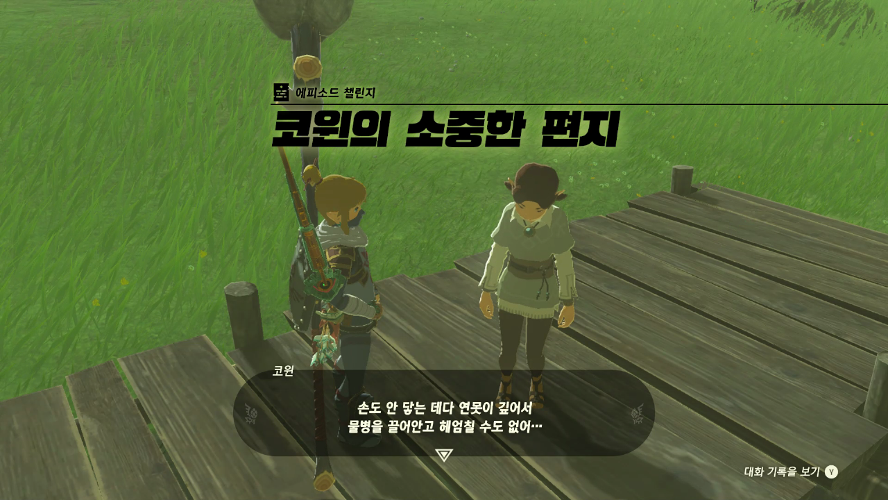연못 가운데 물병이 있는데 뒤에 보면 집 옆에 나무판자가 있다 나무판자를 이용해서 연못 가운데에 있는 물병을 가져왔다 물병을 코윈 근처로 옮기고 대화를 한다 하테노 목장 안에 들어가서 대화를 하면 퀘스트 완료 보상 하테노 치즈