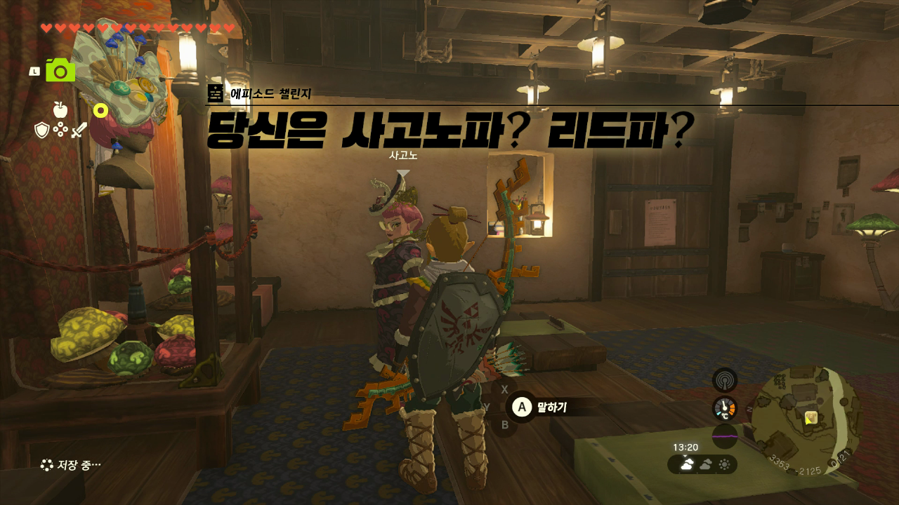 동추낙 마구간 위에 가면 퀘스트를 받을 수 있다 대화를 하면 퀘스트를 받는데 지도에 표시된 장소로 간다 첫 번째 - 올딘의 대화석 지도에 표시된 장소로 가면 거대한 화석이 있다 화석 머리 쪽 아래에 보면 바위가 있다. 바위를 깨면 동그란 바위가 나온다 대화를 하면 눈알 화석을 찾아야 하는데 위에서 찾은 게 눈알 화석이다 찾은 눈알을 맞춰서 넣어주면 된다 대화를 하면 퀘스트 완료 보상 보라 루피(+50 루피) 두번째 - 헤브라의 대화석 지도에 표시된 곳으로 가면 동굴이 있는데 동굴 안으로 들어간다 동굴 안에 들어가서 대화를 하면 손가락뼈랑 등뼈가 빠져 있다고 한다 왼쪽에 손가락, 오른쪽은 등뼈가 있다 바위를 부수고 뼈를 뺀다 얼음을 녹이고 뼈를 빼면 된다 보상 보라색 루피(+50루피) 세 번째 - 겔드의 ..