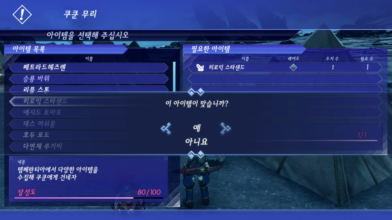 아이템음 쿠쿤에서 건내서 달성도를 100% 만들어줘야 한다.