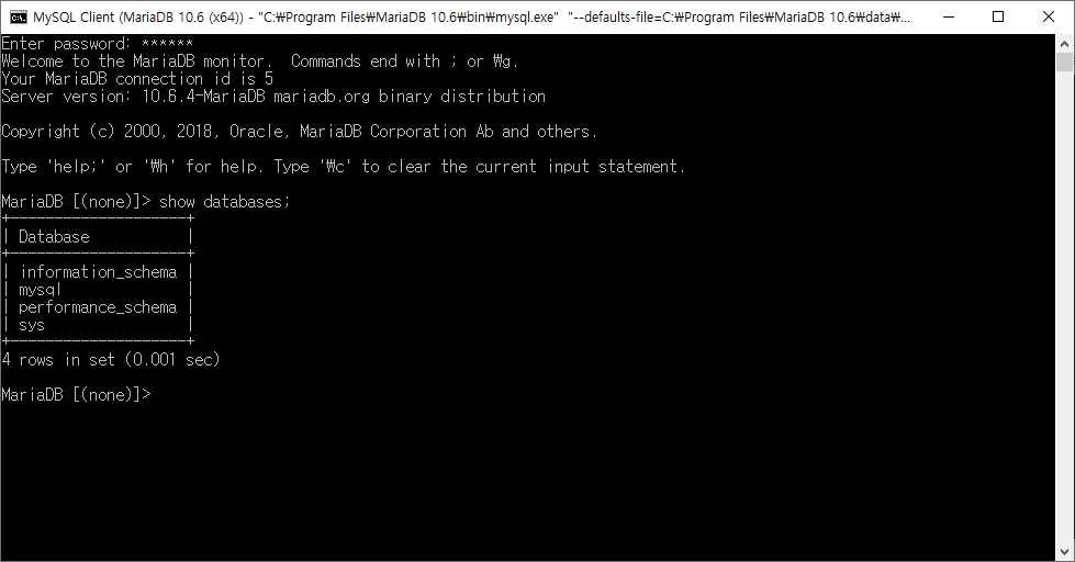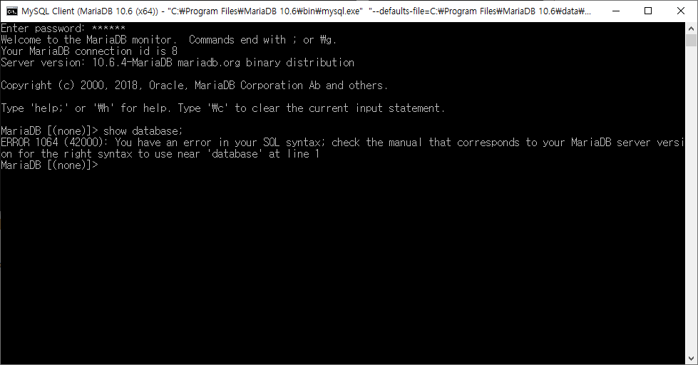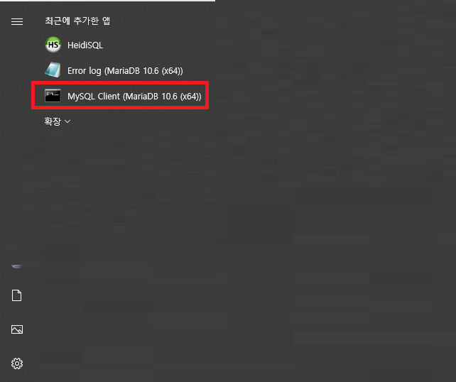 시작에서 MySQL Client (MariaDB 10.6 (x64)) 있어서 실행했다