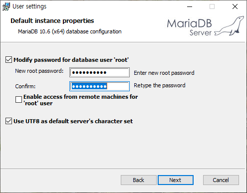 - Enable access from remote machines for 'root' user는 다른 컴퓨터에서 root로 접속 하게 할거냐 묻는내용이라 체크를 따로 안함