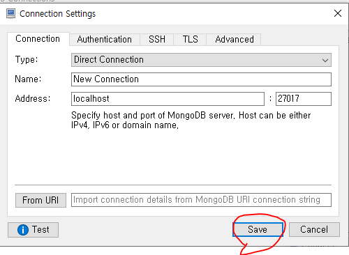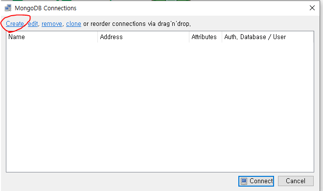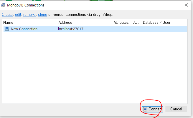 설치가 끝나고 robomongo를 실행하고 연결