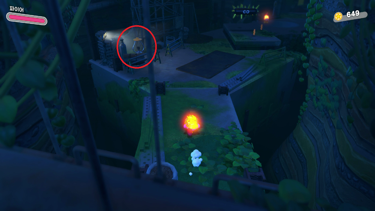 4개의 랜턴 스위치에 불 붙이기 1/4 : 처음 시작하면 불을 뿜는 몹이 있다. 불 능력을 얻고 오른쪽에 랜턴이 있다
