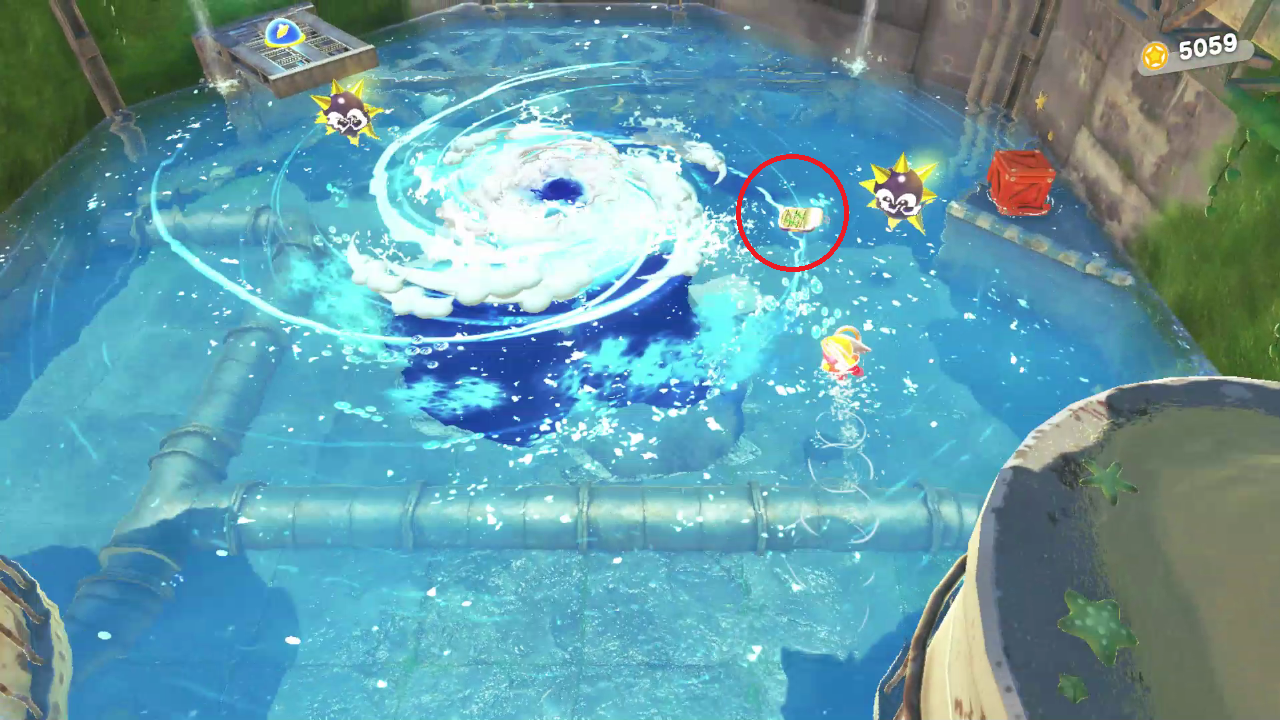 통조림 3개 먹기 3/3 : 큰 회오리 옆에 통조림이 보인다. 통조림을 먹고 왼쪽 파란색 버튼을 누르고 이동한다