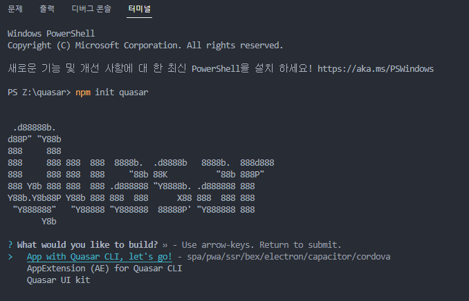 Quasar CLI로 설치를 했다 ( 참고 : https://quasar.dev/start/pick-quasar-flavour )