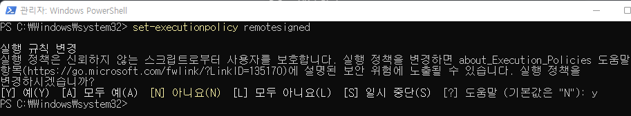 설정후에 다시 확인해보니깐 RemoteSigned 로 나온다
