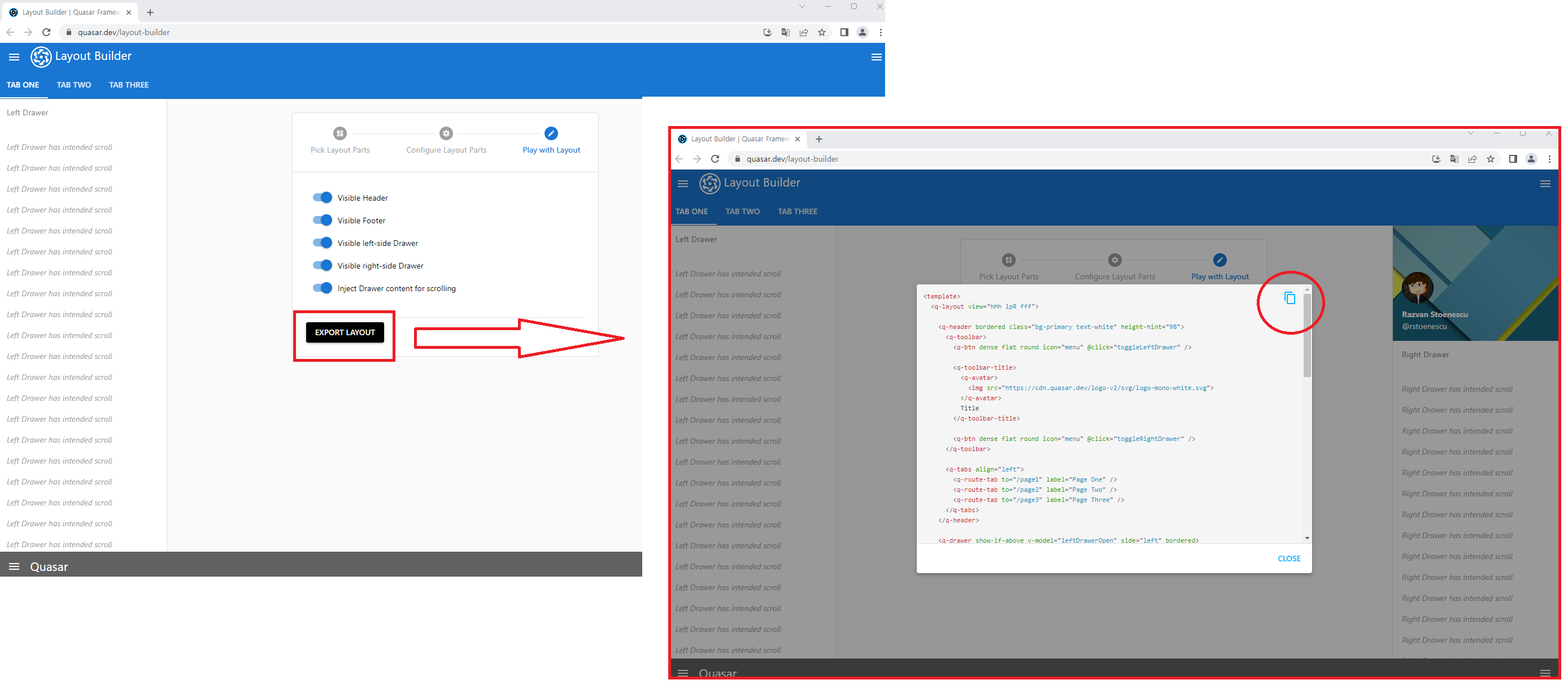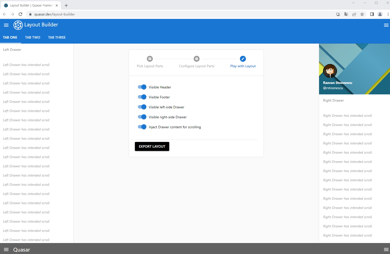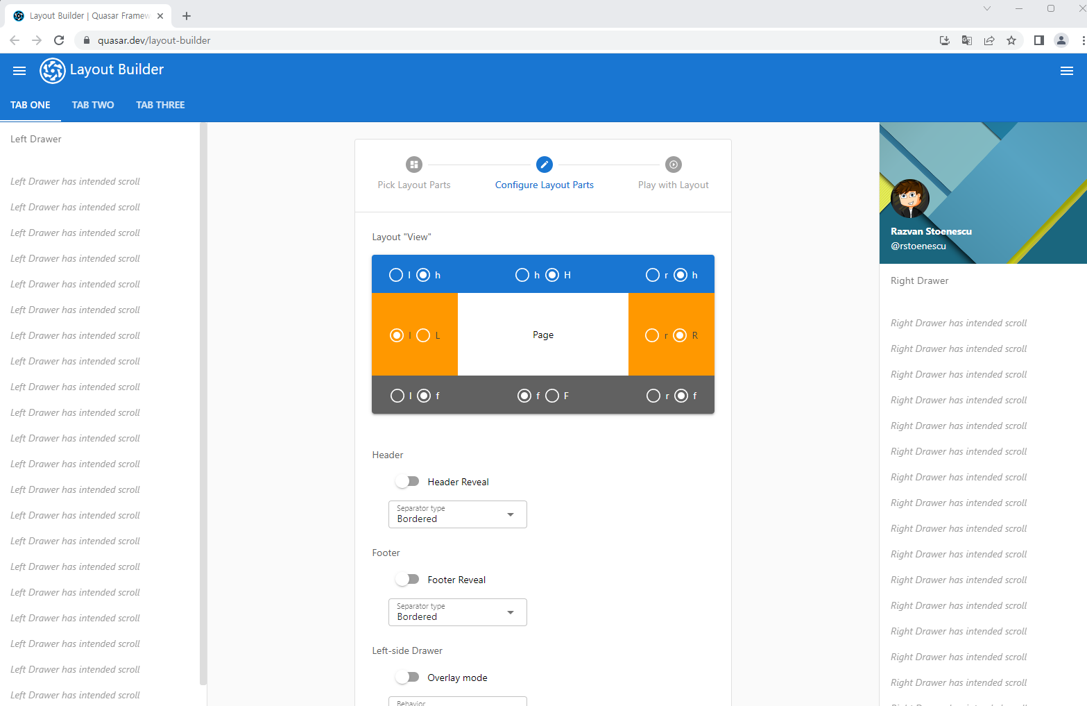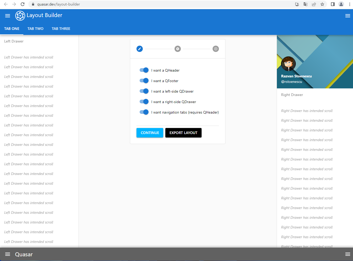 quasar 공식 사이트에 들어가면 레이아웃을 마우스 클릭으로 만들 수 있다