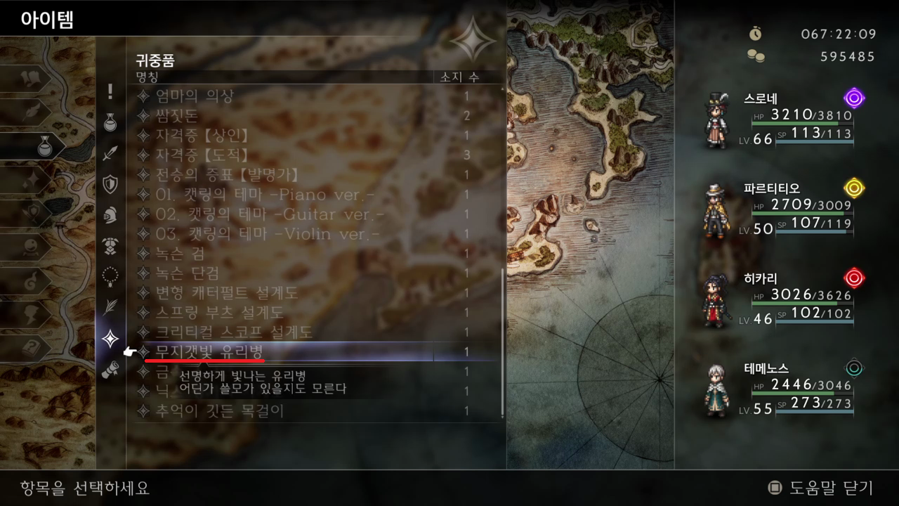 바다가 쪽에 보물상자를 열면 무지개빛 유리병이 있다