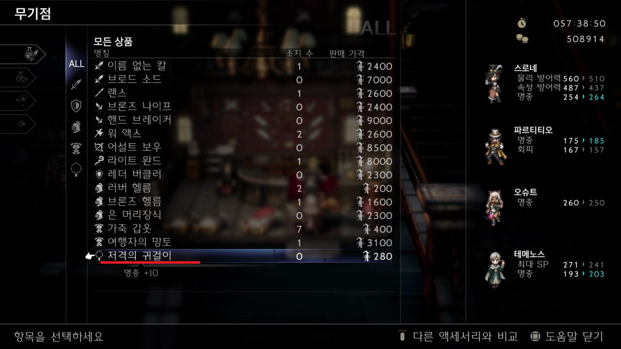 뉴 델스타 마을 무기점에서 저격의 귀걸이 구매