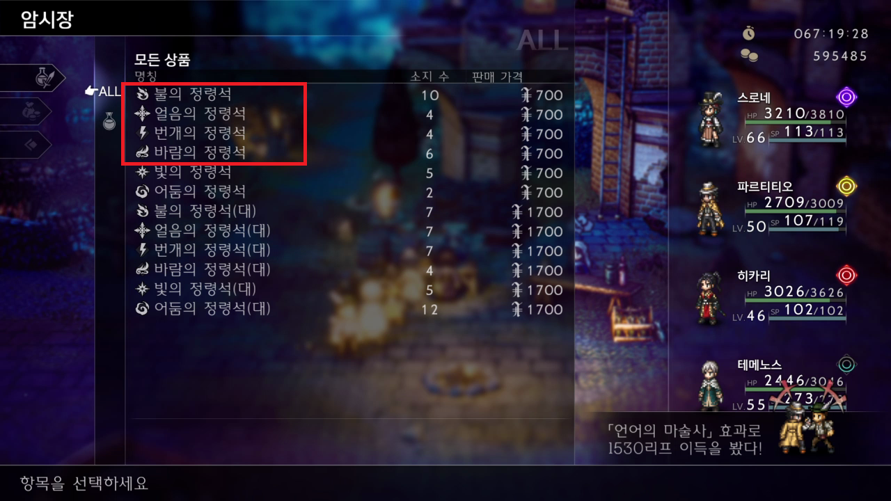 표시한 NPC 상품을 보면 정령석을 파는데