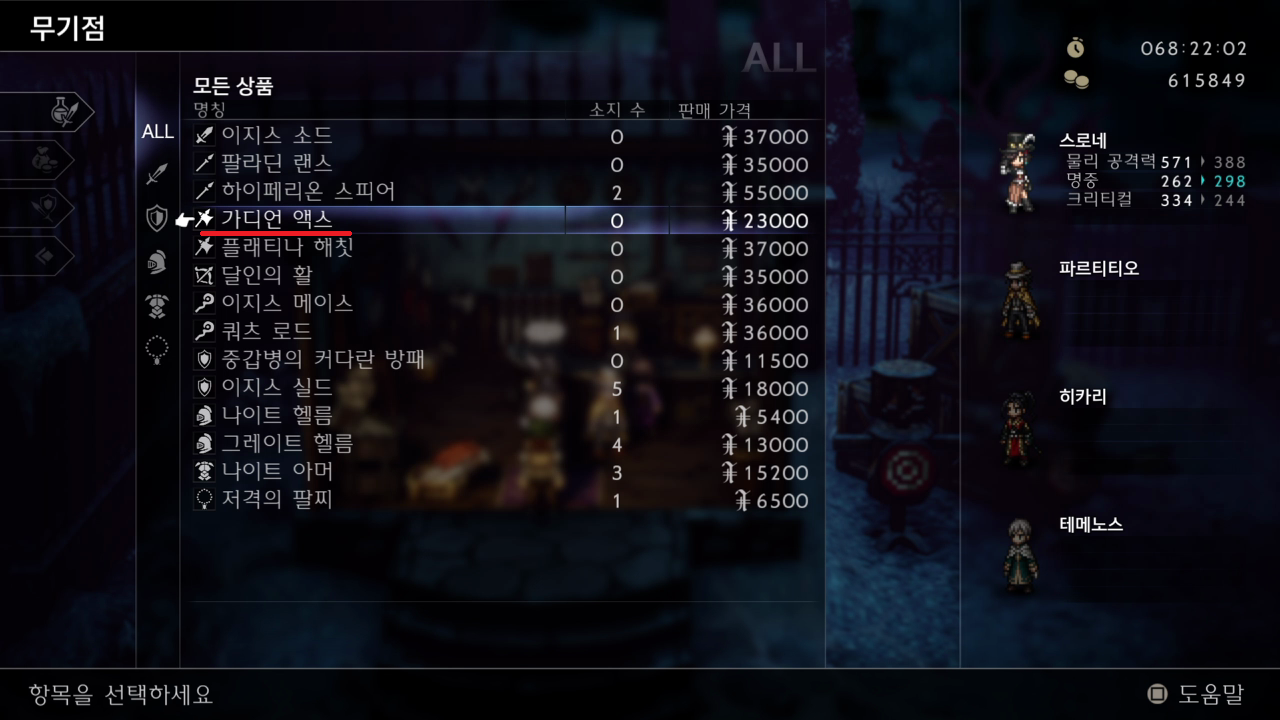 스톰헤일 마을 무기점에서 가디언 액스 구매