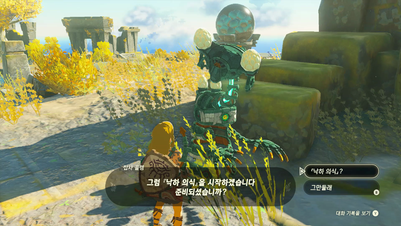 섬에 도착해서 집사 골렘하고 대화를 해서 낙하 의식을 두 번 진행하면 된다