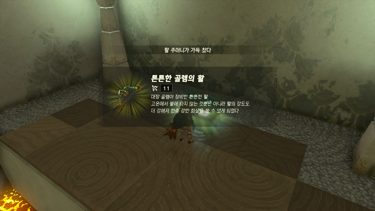돌을 하나씩 붙여 높게 쌓아서 열었는데 튼튼한 골렘의 활이 있다