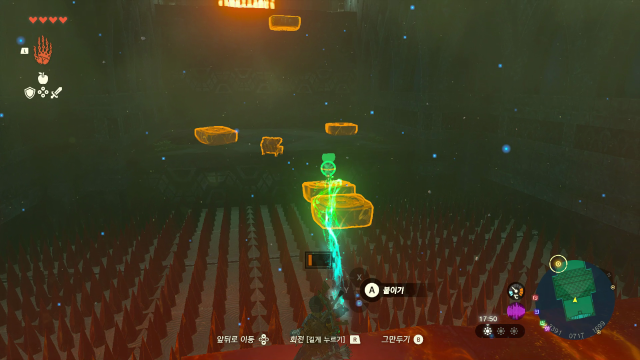 빠르게 돌아가는데 조각상이 있는데 안에 화살로 때리면 된다 점프 + 화살 공격