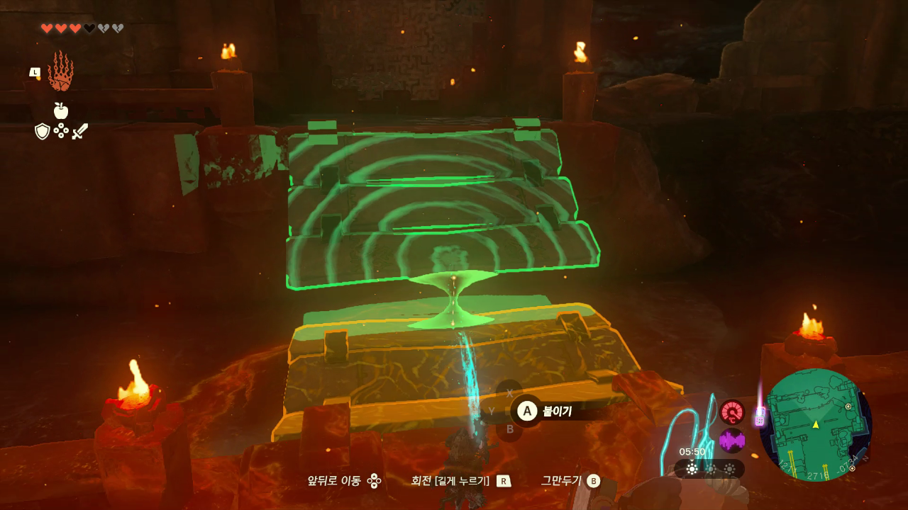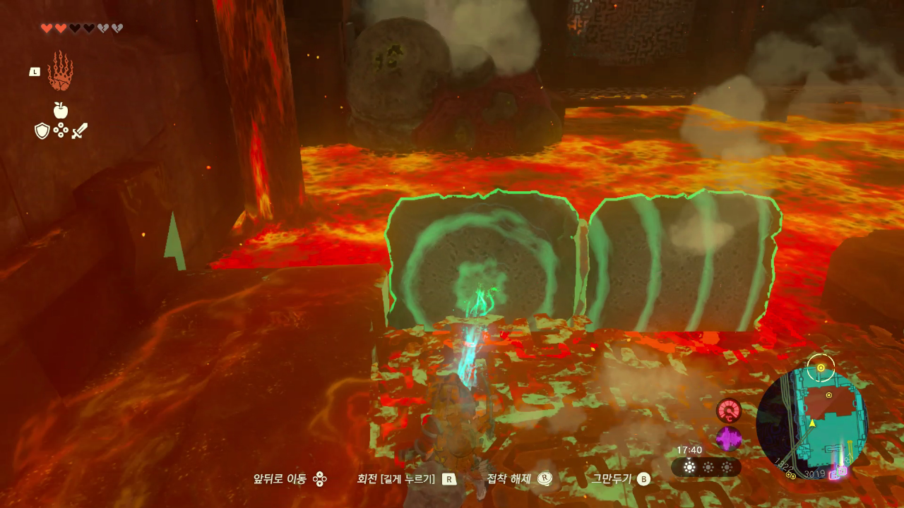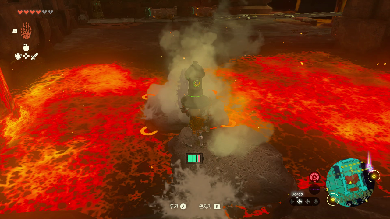 도착하면 용암이 있는데 근처에 있는 소화기로 돌 두 개를 이어서 만들어서 용함이 흐르는 곳을 막는다