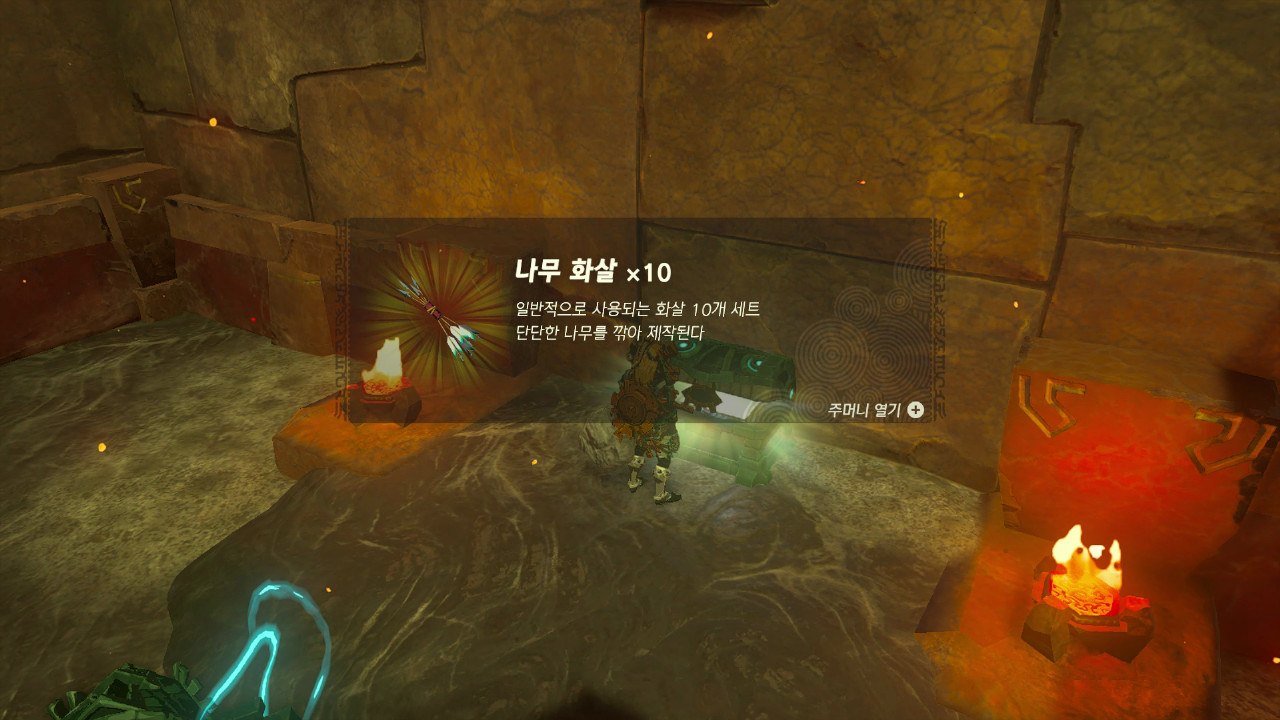 아래 스샷에서 보이는 오른쪽 레일을 타고 가면 상자가 있는데 열면 나무화살 x10 개 획득