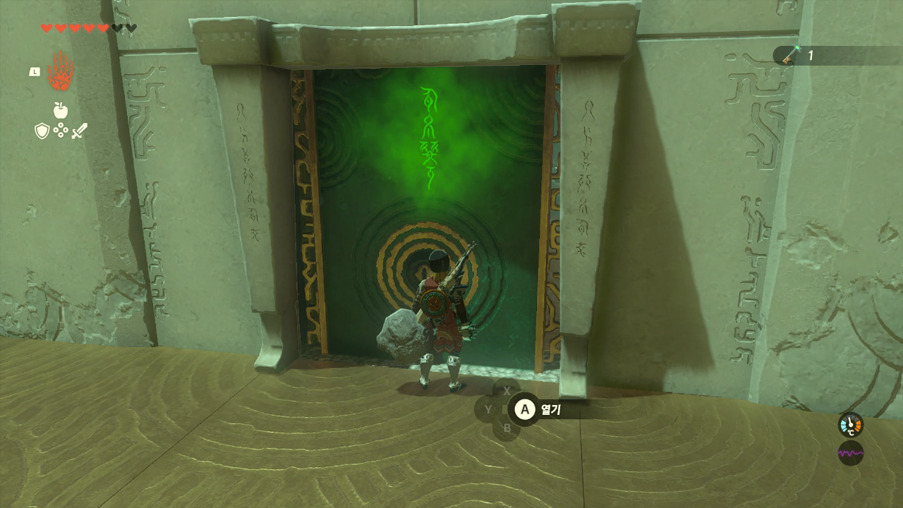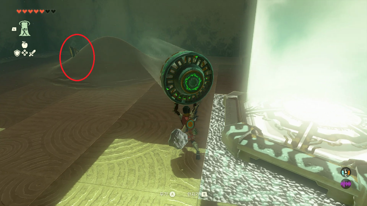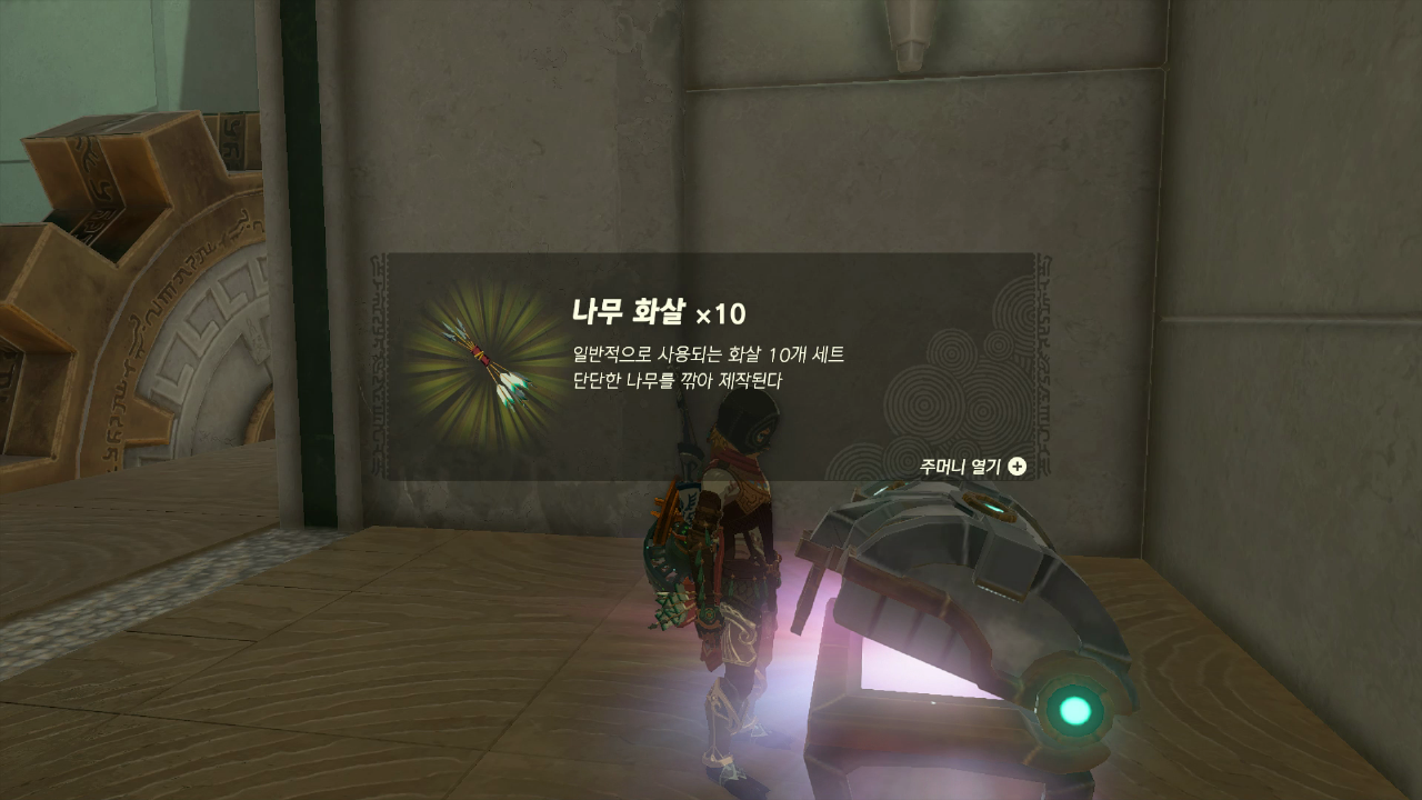 올라가서 톱니바퀴에 있는 모래를 날리면 문이 열리고 상자에서 나무화살 x 10개 획득