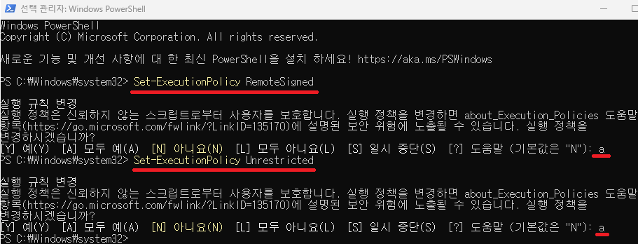 PowerShell 을 관리자 권한으로 실행을 하고 나서