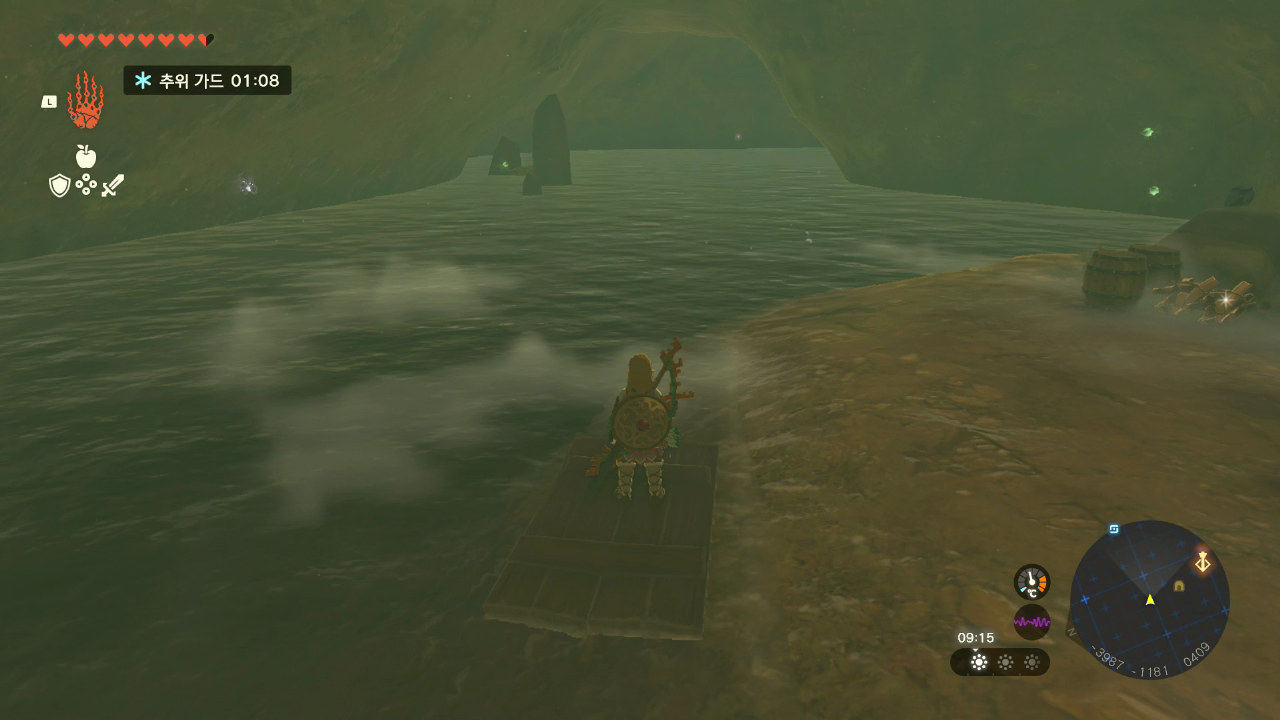 동굴에 들어가서 앞에 보이는 나무판자를 물에 띄우고