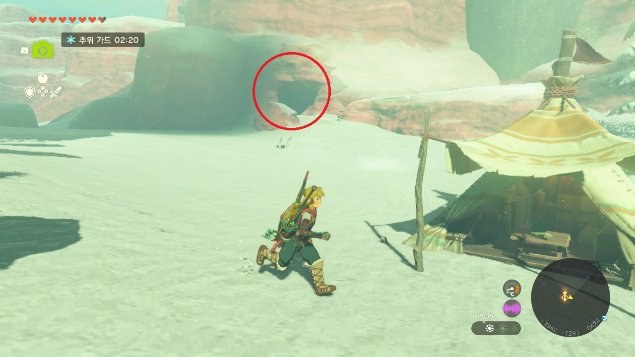 텐트 뒤에 보이는 동굴로 들어간다