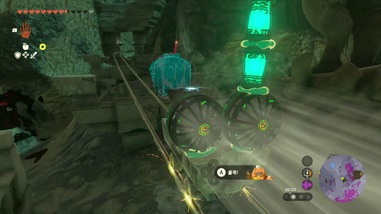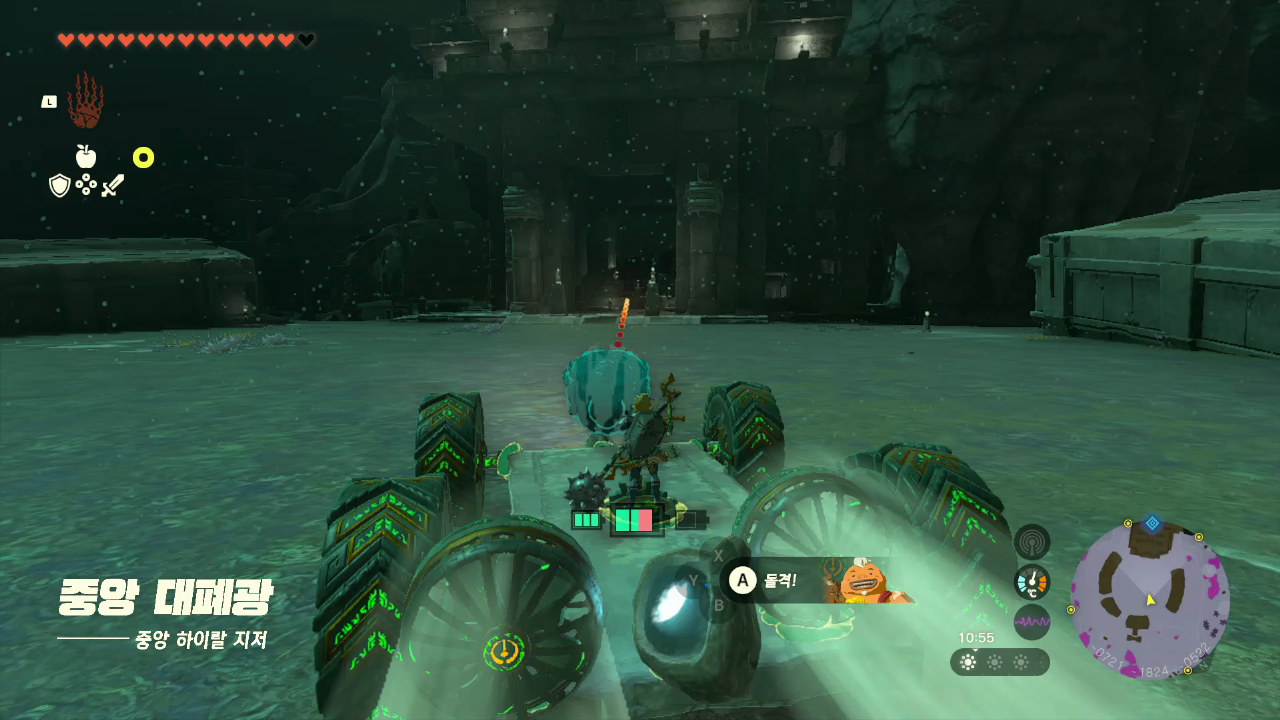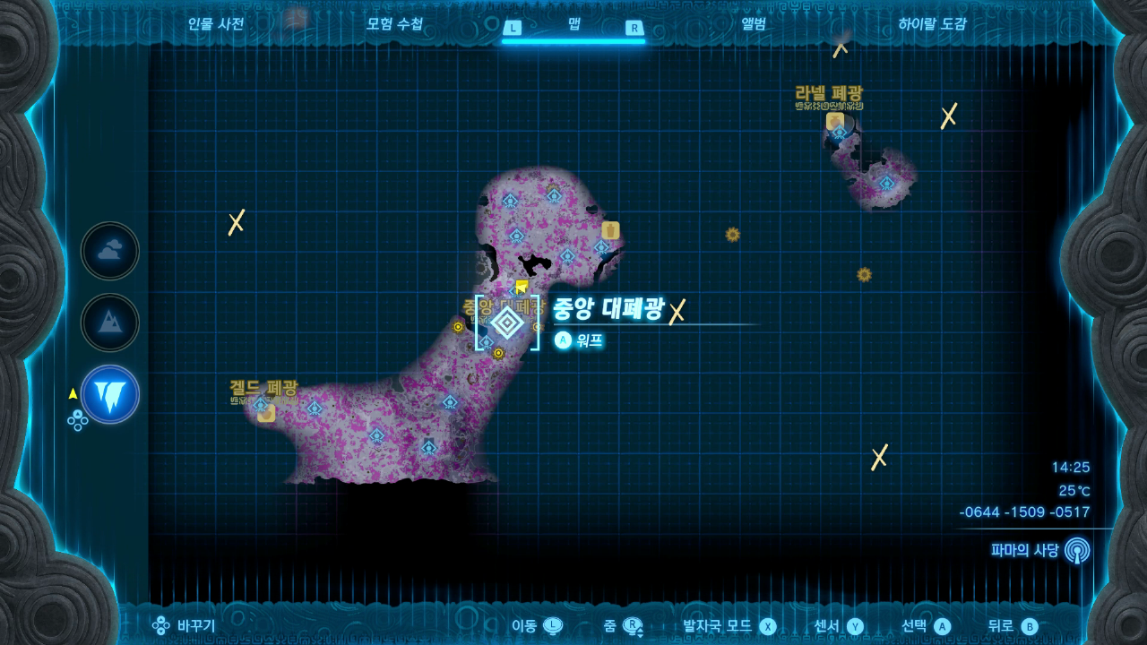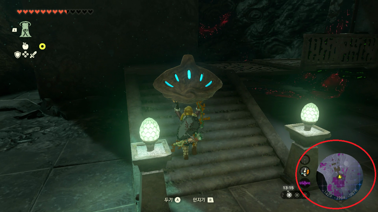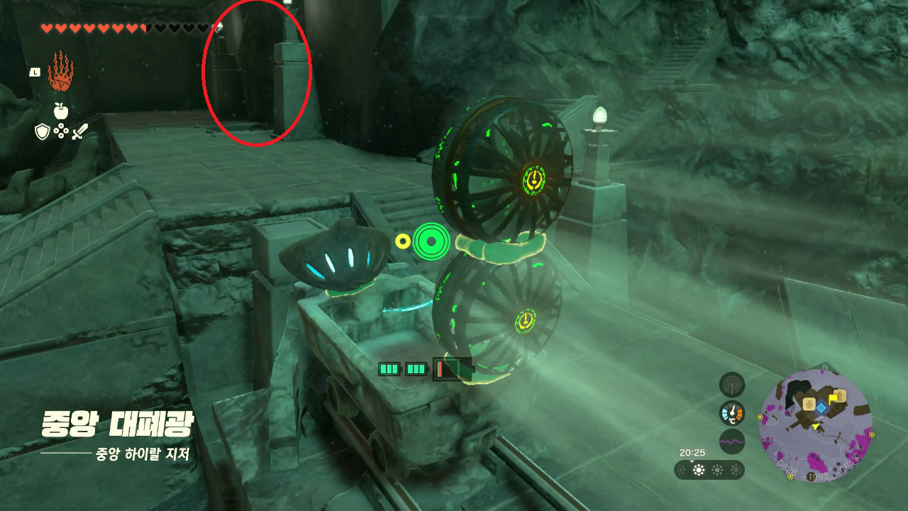 아래로 내려가 눈 모양 돌을 들고 중앙 대폐광으로 이동해야 한다