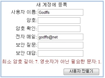 | Register.aspx 파일을 웹 브라우저로 열고 테스트 합니다. 계정 등록하는 화면에서 비밀번호 또는 기존에 가입된 아이디를 입력하게 되면 애러가 자동으로 표시됩니다. [그림67-4]는 비밀번호 잘못 입력시 나타나는 화면입니다. ![]() 특수문자, 영문 대/소문자, 숫자 를 사용하게 되면 해킹에 대한 노출을 어느정도 막을 수있다고 하니깐 비밀번호 모두 변경하세요...저는 영문,숫자만 사용했는데 바꿨어요~ 그래서 웹 주소창에 Default.aspx를 직접 입력 (또는 Default.aspx 페이지 실행) 하시면 로그인 된 상태를 확인 할 수있습니다. |
