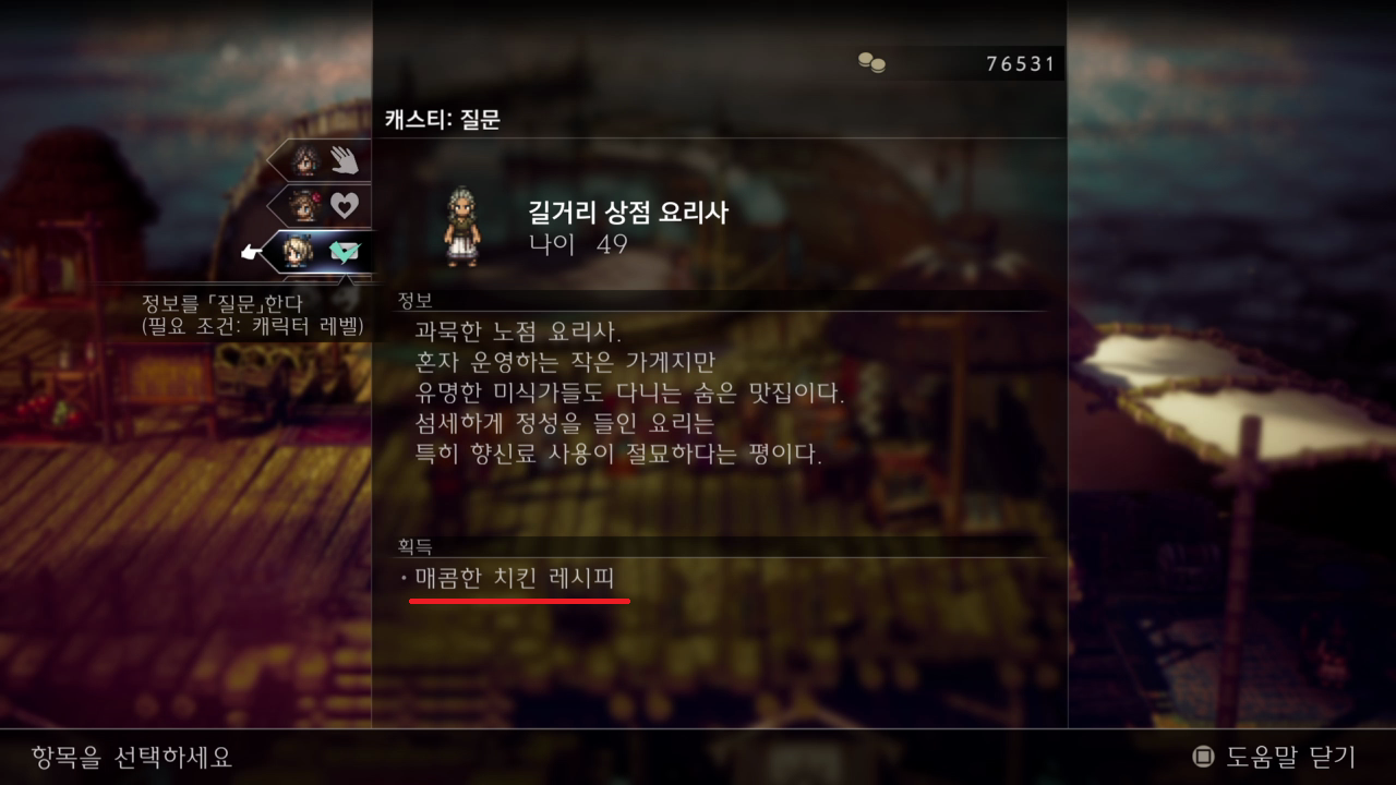 극장으로 내려가기 전에 NPC한테 캐스티로 질문을 하면 매콤한 치킨 레시피를 알려준다