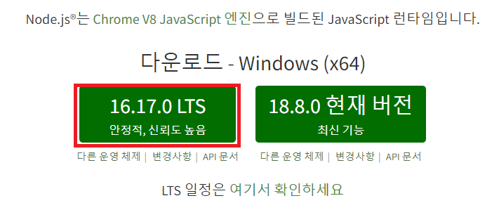 1. node.js 설치하기 : https://nodejs.org/ko/ Node.js Node.js® is a JavaScript runtime built on Chrome's V8 JavaScript engine. nodejs.org node.js 16 버전으로 설치를 하고 명령 프롬프트 창에서 확인한다 2. Visual Studio Code 설치하기 : https://code.visualstudio.com/ Visual Studio Code - Code Editing. Redefined Visual Studio Code is a code editor redefined and optimized for building and debugging modern web and cloud applications..